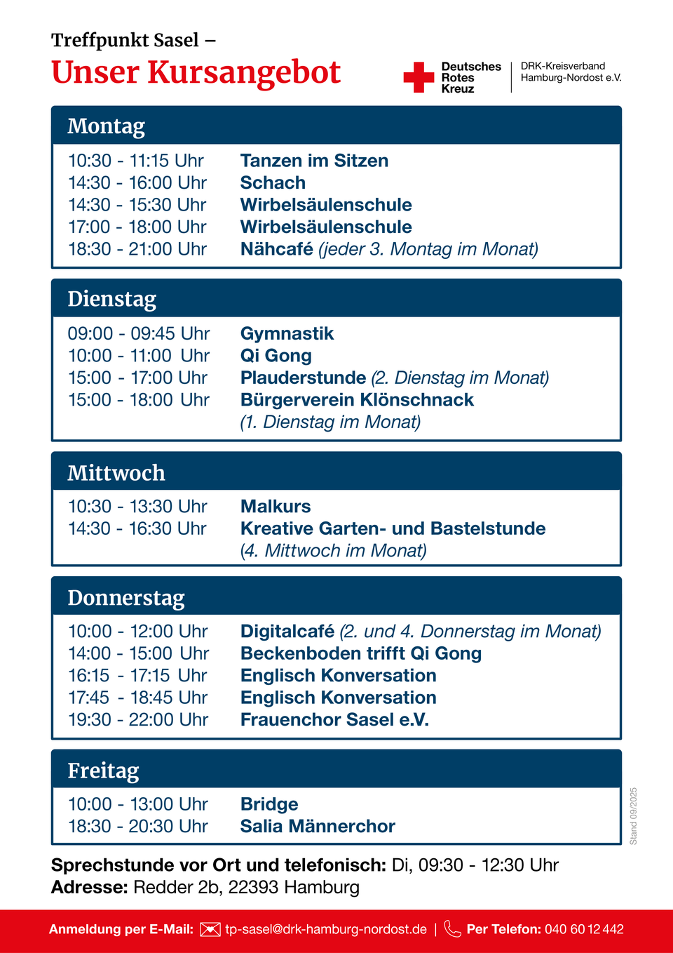 Telefonische Sprechstunde: Montag bis Mittwoch von 09:30 - 12:30 Uhr unter 040 6012442